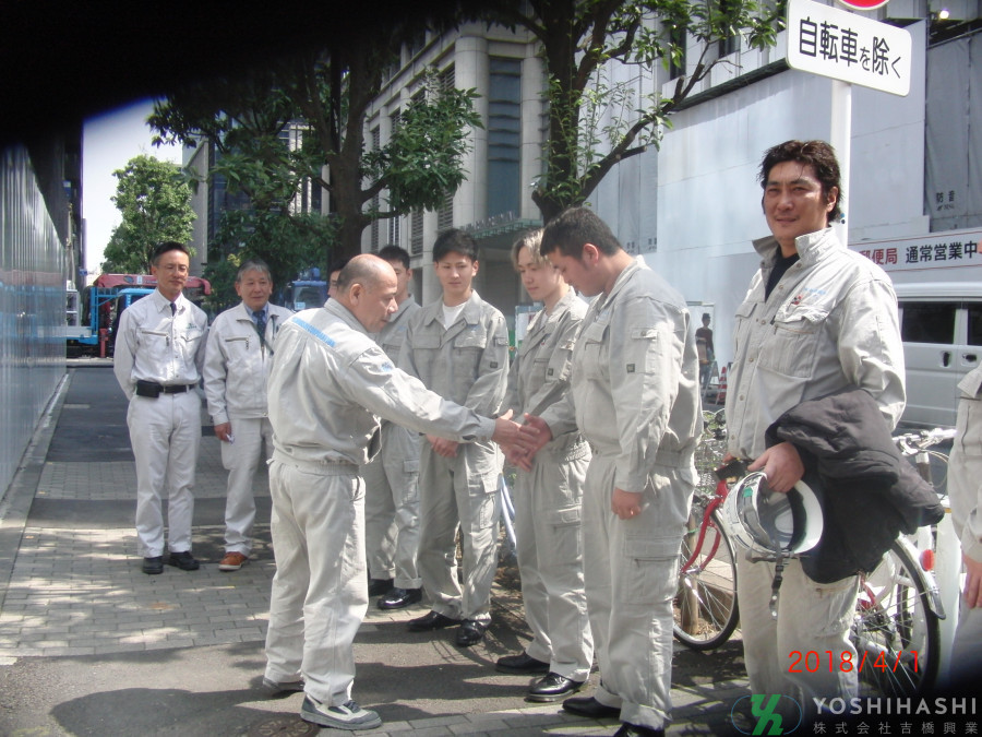 入社式の後、早速作業着ユニフォームに着替えて、幹部社員のいる作業所に挨拶に行きました。