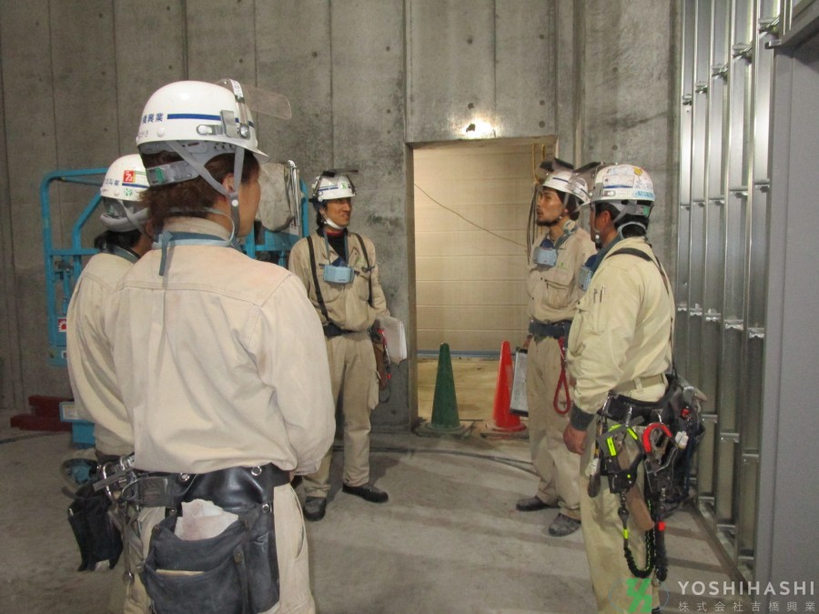 作業所では当社は作業の始まる前、朝と昼に必ず現地KY活動を行います。写真は職長から注意事項を伝達指示しているところです。 大切なのは各自が作業の危険性を知ること。当社社内ルールを守ること。現場のルールを厳守する事です。