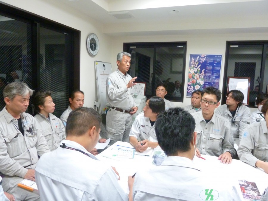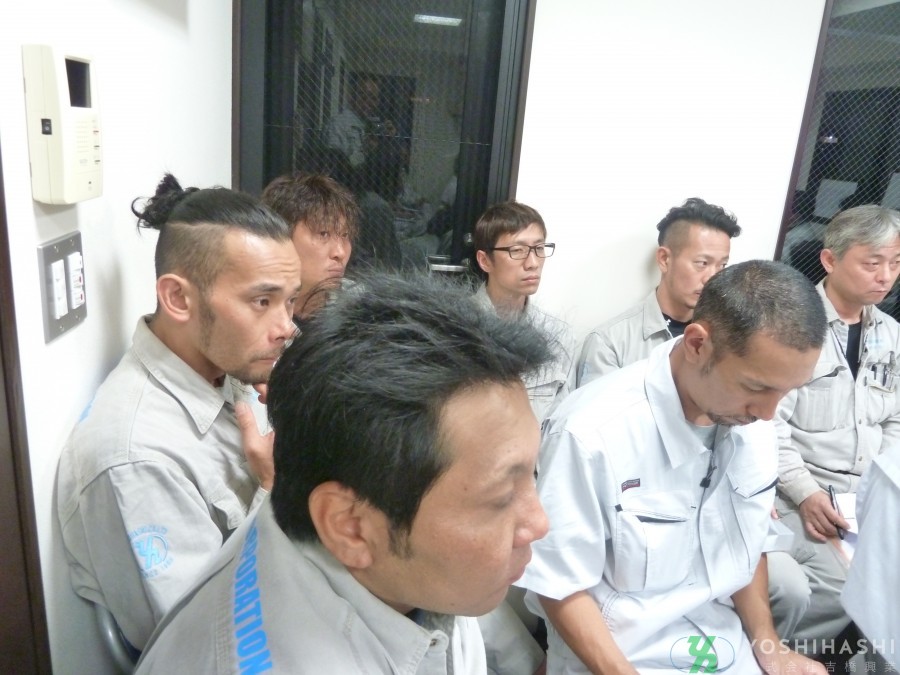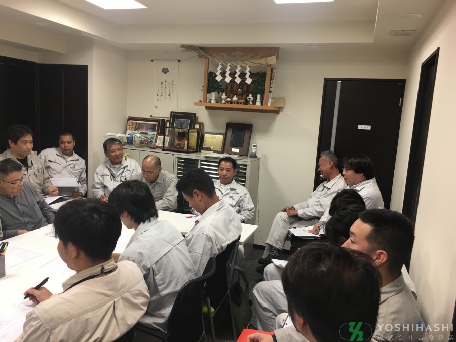 (株)吉橋興業では月2回社長が出席のもと、職長会議が開かれます。現場の工程打合せや、会社のルール、安全についての伝達事項、新しい道具についての説明など全現場の職長と設計が参加して話し合われます。会議に出席しない人も必ず議事録を読みに来るのがルールになっています。会社の大切な会議です。