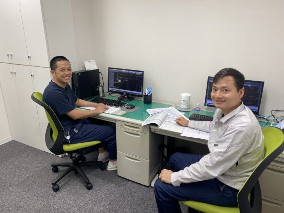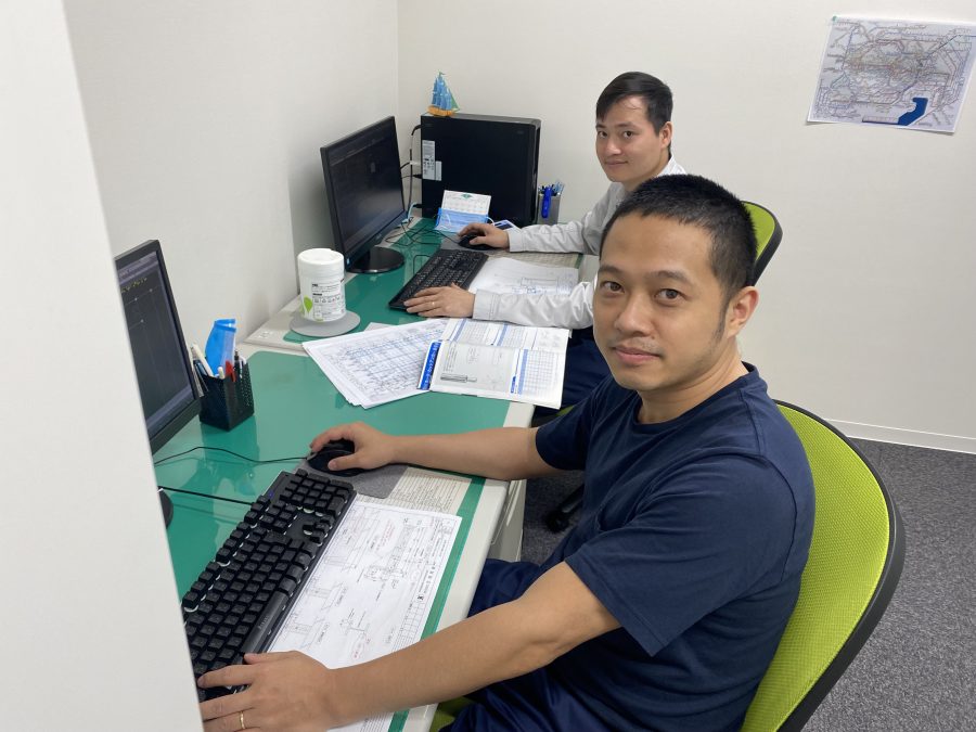 ゴックさん(36歳 手前側)とアインさん(28歳 奥側)は吉橋興業の設計部の正社員です。昨年の12月に来日して7か月になりました。今ではすっかり慣れてきて、他の内勤社員とも打ち解けています。家族はベトナムに残してきているので、毎日インターネット電話で通話して元気を確認しあえるそうです。2人はベトナムの建築大学を卒業してきて、ゴックさんは、向こうでは建設会社で技術部長として大きなプロジェクトもやってきました。アインさんは、ベトナムではアルミサッシの会社で設計や資材の管理を任されてきたそうです。二人とも非常に優秀で仕事も早いです。日本でさらに技術を身に付け、長く働きたいと来日しました。これからは吉橋興業で石下地や、様々な金属工事の図面担当として戦力となって活躍してくれることでしょう。早くコロナが納まったら、大好きなサッカーなど職人の若い社員とも一緒にやるのが楽しみです。