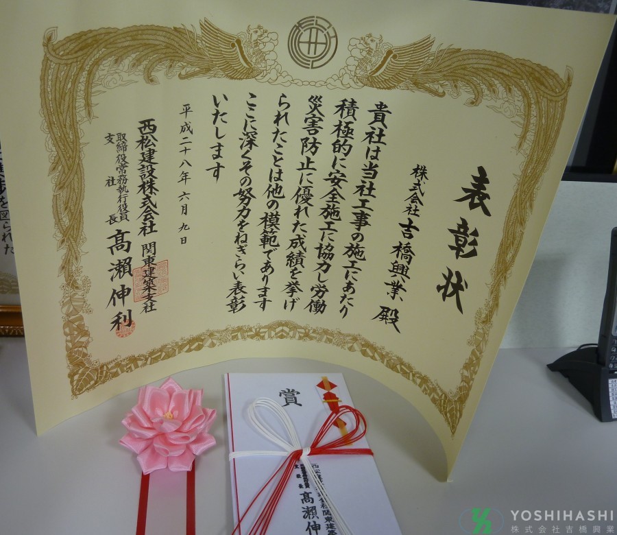 西松建設(株)関東建築支社 平成28年度安全大会において、弊社は協力会社を代表して支社長表彰を頂きました。三田ビルほか、西松建設様の現場に携わられた職方さんたちのおかげです。これからも安全施工で他の模範と言われるように頑張りましょう。